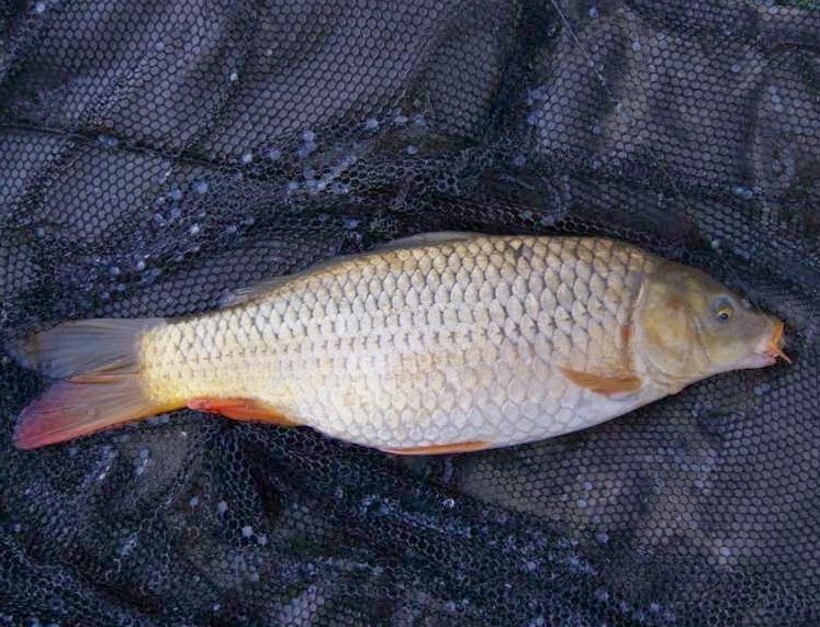 Han hade slängt ett par nävar med Mistrals Ten pellets i kanten utanför ett träd och här kom den lilla fjällkarpen på besök och dessa iögonfallande Dumbells blev lite för mycket bland alla pellets.